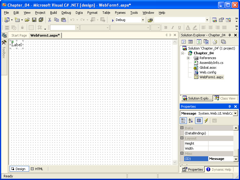 Open Visual Studio .NET and create a new Web Application project called Chapter_04.