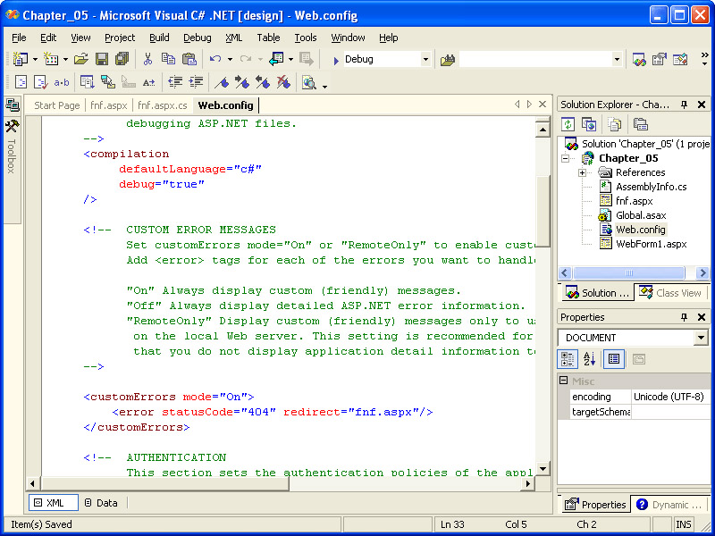 1. Open Web.config (if it isn’t already open) by double-clicking it in Solution Explorer.