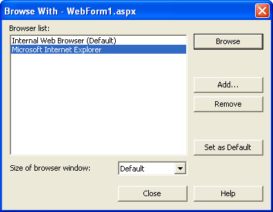 10. Right-click WebForm1.aspx (the default Web Form added to the project when it was created), select Browse With, then select Microsoft Internet Explorer from the Browser List window, and then click Browse, as shown in the following illustration. (This will open the page in a separate browser window, rather than one embedded in the IDE.)