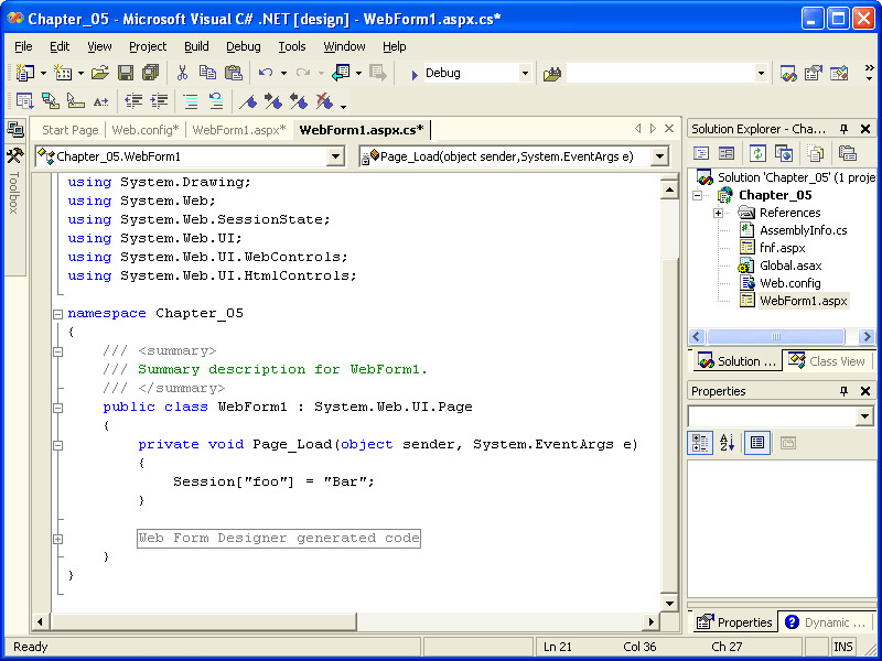 5. Replace the comment in Page_Load with the following code, shown in the following illustration: