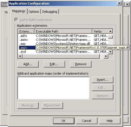 3. To verify that the configuration was successful, open the IIS Manager, navigate to the application in question, right-click the application and select Properties, and then click the Configuration button. In the Mappings tab, scroll down to the .aspx extension, and hover the mouse over the Executable Path column for that extension. The version number in the tooltip that displays the path to the executable should look like the one in the following illustration (from the Windows Server 2003 version of the IIS Manager).
