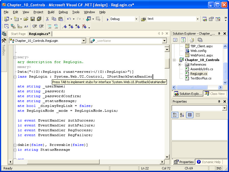 Implement the LoadPostData method defined in the IPostBackDataHandler interface to load the posted values into the local variables. Visual Studio .NET makes this pretty easy. When you finish typing the name of the interface, you will be prompted to press the Tab key to implement the methods in the interface, as shown in the following illustration. Press Tab when prompted after typing the name of each interface. The definition of the methods will be automatically inserted into the file. The methods will be in collapsed #region sections (used to hide/show regions of code in the IDE), so you will need to click the + sign next to each region to see the methods.