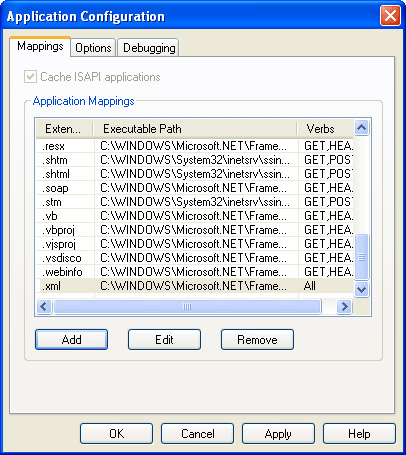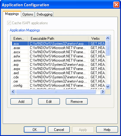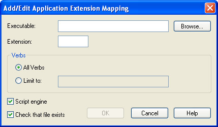 In the Mappings tab, which is selected by default, click the Add button. The Add/Edit Application Extension Mapping dialog box will be displayed, as shown in the following illustration.