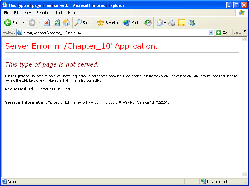 This will prevent any requests for a file named Users.xml within the scope of the application from being fulfilled by passing the request to the HttpForbiddenHandler HttpHandler class. This is the same technique used by ASP.NET to protect the global.asax, web.config, and other non-browsable files.