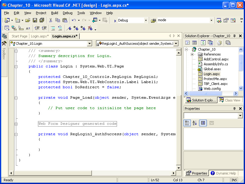 Go back to Login.aspx, and select the RegLogin control. In the Properties window, click the lightning bolt icon, and then double-click the AuthSuccess event from the list. This will add an event handler for the AuthSuccess event to the code-behind module for the page, as shown in the illustration on the next page.