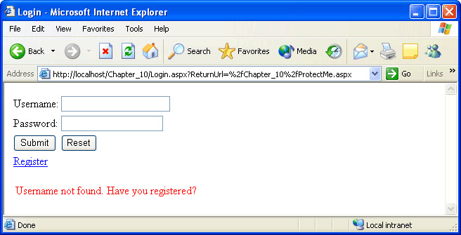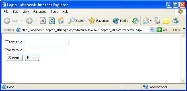 Now that you’ve finished your login page, you’ll test it by attempting to access ProtectMe.aspx, which is protected from anonymous access by the <location> section you added to Web.config earlier.