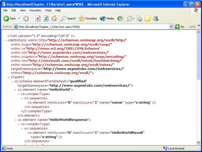 You can scroll through the entire document and see the complete Web Services Description Language (WSDL) contract for the Web service method. Click the Back button on the browser and select the other link on the page, HelloWorld. The screen should look similar to the following illustration.