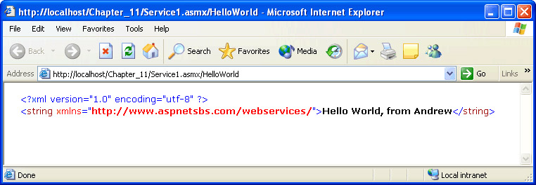 Browse the web service again using Internet Explorer, as described in step 6. The result should look similar to the following illustration: