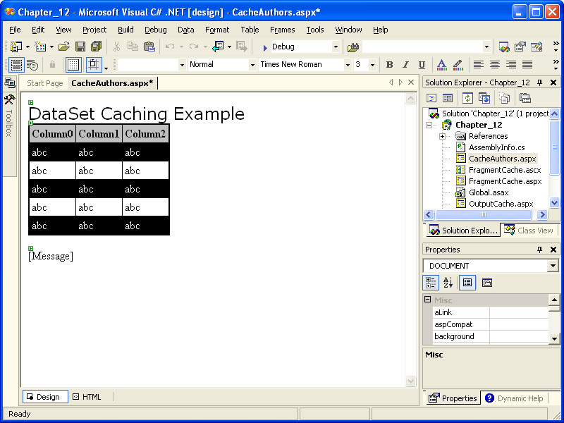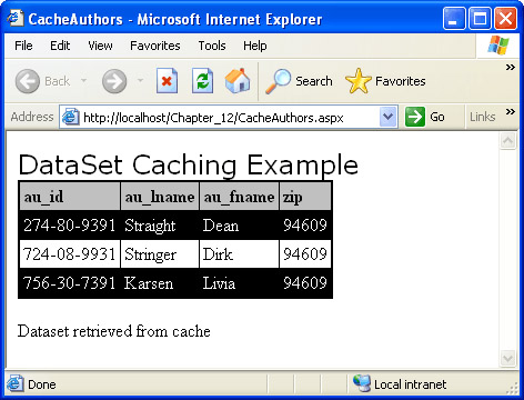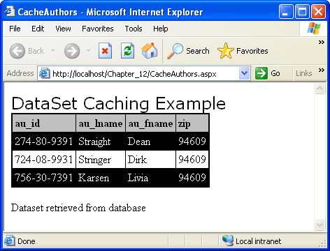 You can also use this technique to store more than just strings. For example, the code in the following example, CacheAuthors.aspx, checks the cache to see if a dataset already exists. If not, it calls a method that creates a dataset containing data from the Authors table of the Pubs sample Microsoft SQL Server database, and then it saves that dataset to the cache before setting the DataSource property of an ASP.NET DataGrid control to the default view of the first table in the dataset (0). In this example, rather than adding controls via the designer, you will add controls in HTML view and then see the results in design mode. Visual Studio .NET is a true two-way design tool.