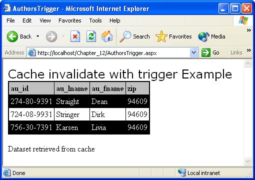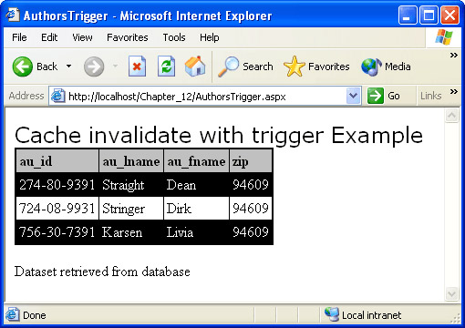 In the same project as the last exercise, add a new Web Form AuthorsTrigger.aspx. Follow the steps in the previous exercise so that AuthorsTrigger.aspx and its code-behind match the code from CacheAuthors.aspx.