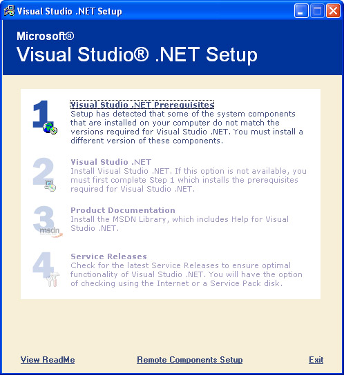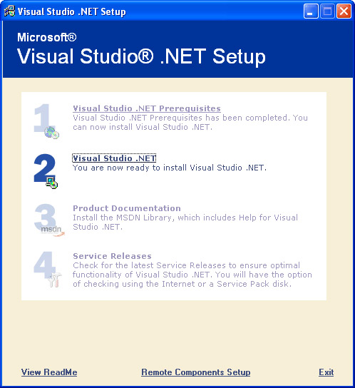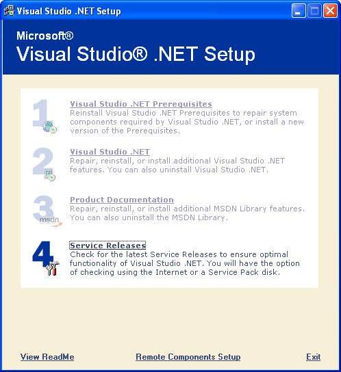 Click View ReadMe in the Visual Studio .NET Setup dialog box if you want to read about installation and uninstallation, known issues, and other release notes. When you are finished, click Exit to exit Visual Studio .NET 2003 setup.