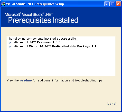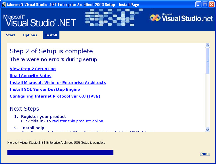 Once Step 2 of the Visual Studio .NET installation is complete and you’ve clicked Done, the following dialog box will be displayed.