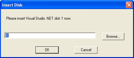 Insert disk 1 of Visual Studio .NET into your CD-ROM drive. (Change the drive letter displayed in the dialog box to the letter of your CD-ROM drive if necessary.) Click OK.