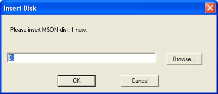 Insert disk 1 of the MSDN Library into your CD-ROM drive. (Change the drive letter displayed in the dialog box to the letter of your CD-ROM drive if necessary.) Click OK.