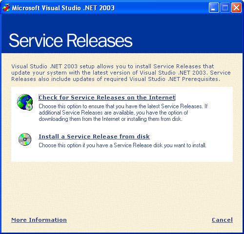 Visual Studio .NET Setup allows you to check for service releases (collections of patches) via the Internet to ensure that your software is up to date.