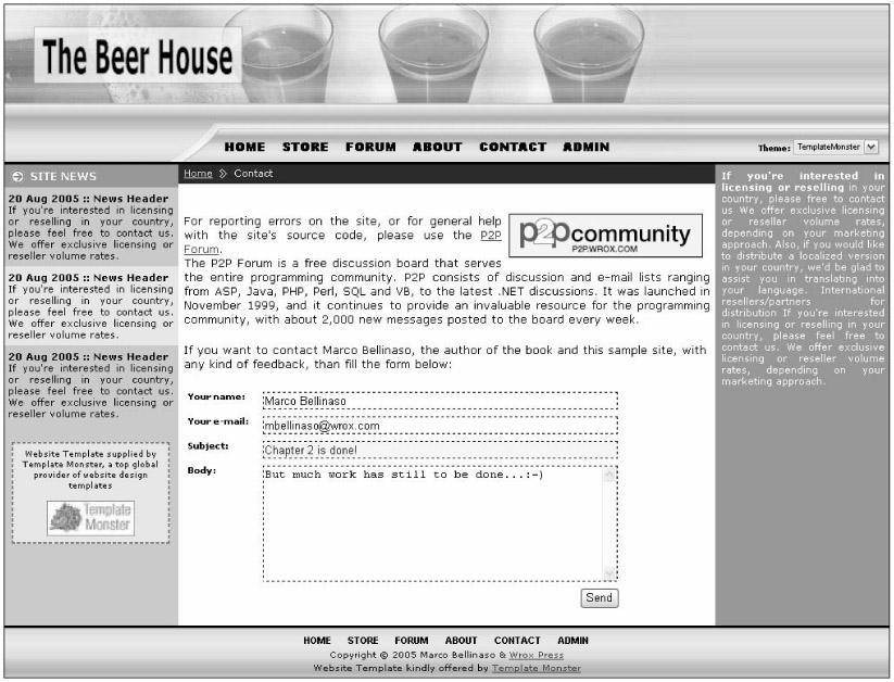 To see how these settings are actually used, let's create the Contact.aspx page, which enables users to send mail to the site administrator by filling in a form online. Figure 3-22 is a screenshot of the page at runtime.