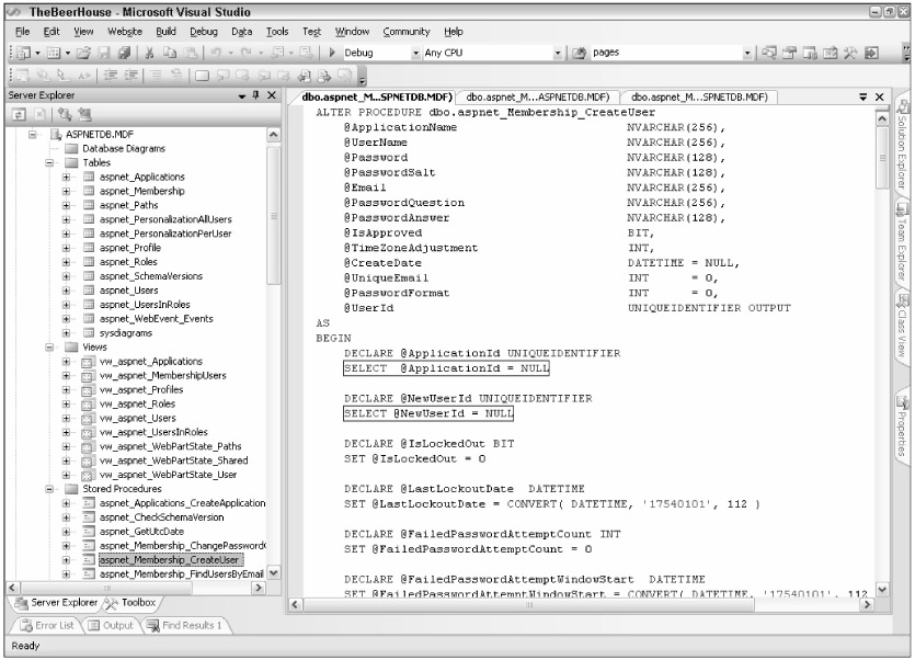 You can register more providers inside the <providers> section, and choose which one you want to use by specifying its name in the defaultProvider attribute of the <membership> element (not shown above). Another attribute of <membership> is userIsOnlineTimeWindow, which specifies how many minutes after the last activity a user is still considered online. That is, if a user logs in, brings up one page, but then closes her browser immediately, she will be counted as being online for this number of minutes. We need this kind of parameter because we have no definite way to know when a user has left the site or closed down their browser. You can test this by checking the value returned by Membership.GetNumberOfUsersOnline as users come to your site and then leave.