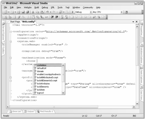 As you've seen thus far, the preferred method of setting up and configuring all the membership and profiling services introduced by ASP.NET 2.0 is to configure XML tags in the web.config file, which is the declarative coding method. To make your job even easier, you now have IntelliSense when you edit web.config in Visual Studio 2005, which wasn't supported in earlier versions, as you can see in Figure 4-12.