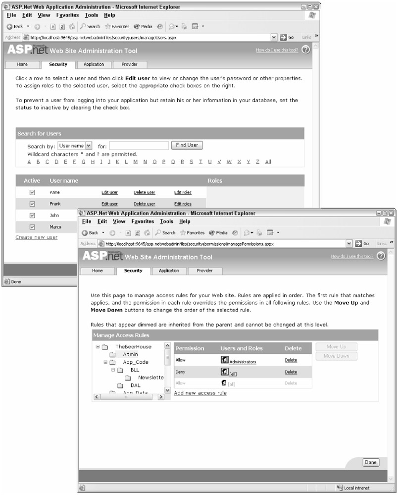 Security: It enables you to set up the authentication mode (you can choose between the Intranet/Windows and the Internet/form-based model), create and manage users, create and manage roles, and create access rules for folders (you select a subfolder and declare which roles are granted or denied access to it). Figure 4-13 shows a couple of screenshots of these pages.