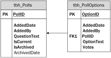 Here you see the primary and foreign keys, the usual AddedDate and AddedBy fields that are used in most tables for audit and recovery purposes, and a few extra fields that store the poll data. The tbh_Polls table has a QuestionText field that stores the poll's question, an IsArchived bit field to indicate whether that poll was archived and no longer available for voting, and an ArchivedDate field for the date/time when the poll was archived (this last column is the only one that is nullable). There is also an IsCurrent bit field, which can be set to 1 only for a single poll, which is the overall default poll. The other table, tbh_PollOptions, contains all the configurable options for each poll, and makes the link to the parent poll by means of the PollID foreign key. There is also a Votes integer field that contains the number of user votes received by the option. In the first edition of the book we had a separate Votes table, in addition to these two, that would store every vote in a separate row, with the date/time of the vote and the IP of the user who cast the vote. I changed the design in this new edition because that additional table made the implementation more difficult and had worse performance (caused by the aggregations you had to run to count the total number of votes for each option), without adding any real benefit.