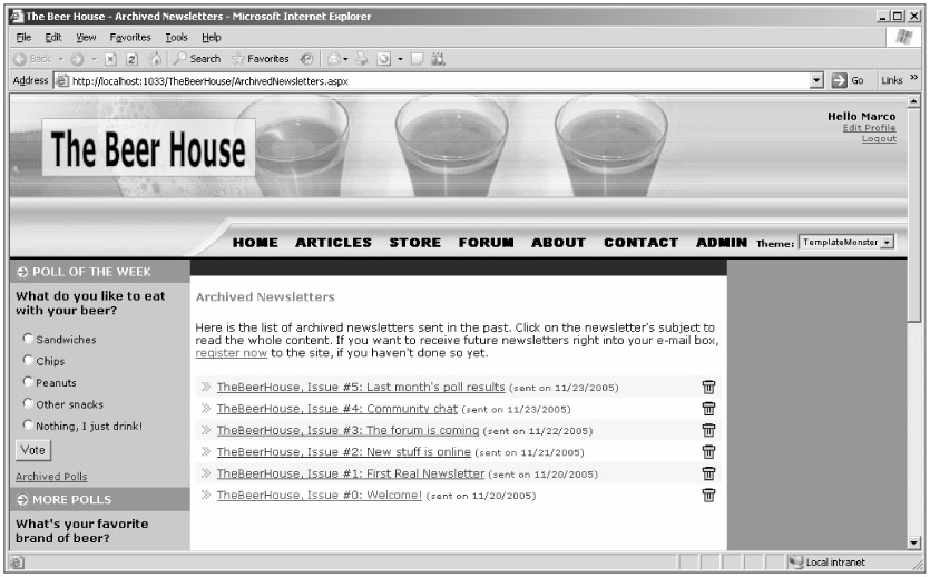 In this last part of the "Solution" section you'll implement the administration pages for sending out a newsletter and checking its progress, as well as the end-user pages that display the list of archived newsletters, and the content of a specific newsletter. Finally, there is the NewsletterBox user control that you will plug into the site's master page, which creates a subscription box and a link to the archive page.