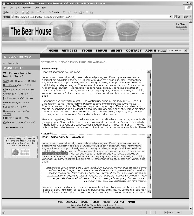 This is the last page of the module, and also the simplest one. It takes the ID of a newsletter on the querystring, loads that newsletter by means of the Newsletter.GetNewsletterByID method, and displays its subject, plain-text and HTML body, in three Literal controls. The bodies may be very long, though, and to avoid having a very long page that requires a lot of scrolling, the Literals for the two body versions are declared inside <div> containers with a fixed height and a vertical scrolling bar. Here's the simple markup body: