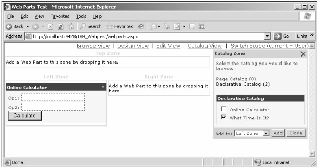DeclarativeCatalogPart: This Web Part must be placed within the CatalogZone, and when the page is in catalog mode it shows a list of Web Parts declared at design time, and allows the user to insert one or more of them into a selected Web Part zone.