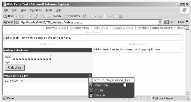 Figure 10-3 shows the page in browse mode after adding both Web Parts. It also shows the drop-down menu of the WhatTimeIsIt Web Part, with its custom-made option that uses client-side JavaScript to pop up a message.