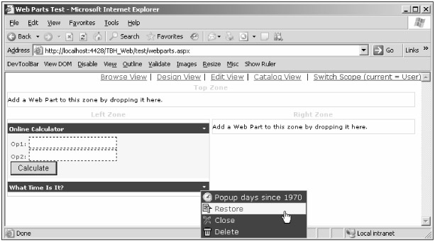 Design: In this mode you can move Web Parts around, from one Web Part zone to another, by dragging and dropping them visually. Web Part zones are rectangular areas on the page where a Web Part can be dropped — only content in these areas can be personalized. A zone can be thought of as being a parking place on the page where Web Parts can reside: You can have a number of zones on one page. The Web Part's context menu also has a command to completely delete the Web Part from the page. The Delete command is different from Close, because Close just hides the Web Part from the page, but doesn't really remove it, so that you can re-open it later.