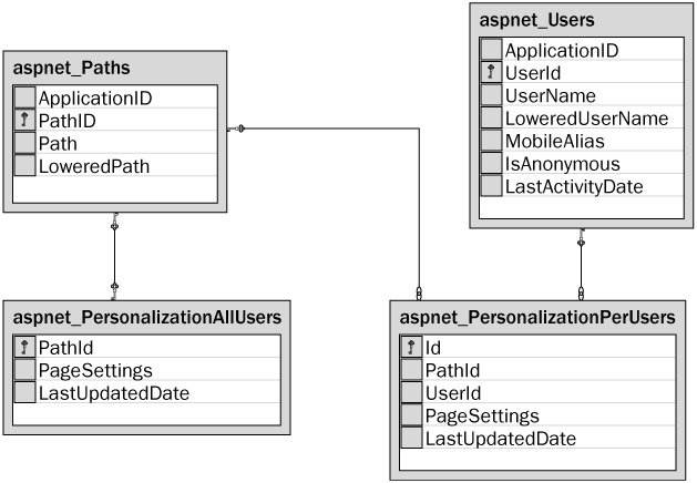 For your reference, Figure 10-8 shows which tables are used to store personalizations on the SQL Server database, and the relationships between them.