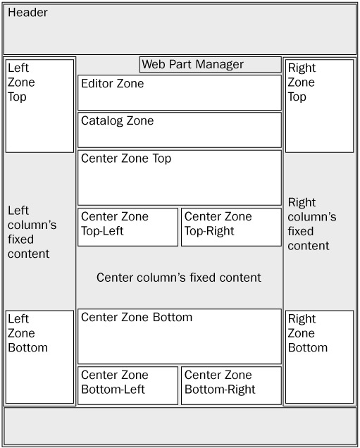 The other important thing is deciding where, and how, to place all the necessary Web Part—related controls on the pages to which you want to add personalization support. Personalization is not something you'll want to add everywhere because it doesn't make much sense to move and change content in the page showing an article or a forum thread. However, you may want to support it in a few other pages in addition to the home page — for example, in the pages listing article categories (ShowCategories.aspx) and subforums (ShowForums.aspx). Instead of placing the WebPartManager, the WebPartZone controls, the editors, and the catalog controls on every page, you'll add all them just once, in the template .master page shared by all pages of the site. Figure 10-9 graphically represents where you'll declare all controls and zones. As you can see, there are parts with fixed content, with Web Part zones placed above and below them, in each of the three columns; in the larger central column there are also two sections where the available space is split into two columns, with a Web Part zone in each of them, so that you can put two or more Web Parts side by side.