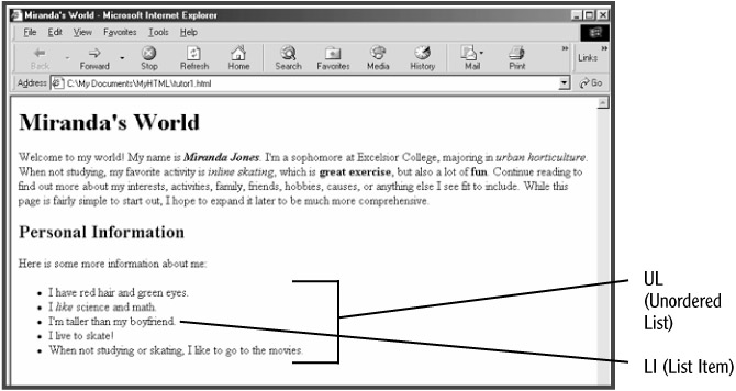 The UL (Unordered List) and LI (List Item) elements are used together to create a list of bulleted items. Add a bulleted list to the example page (see Figure 2.7):