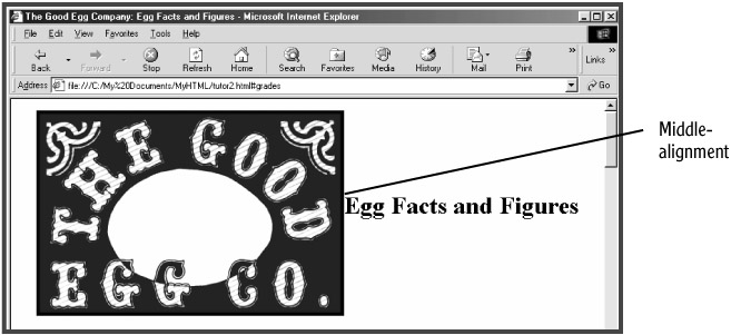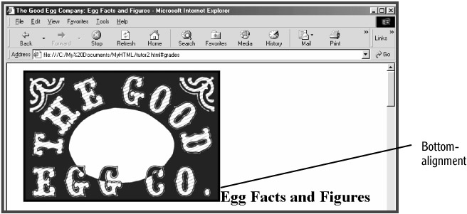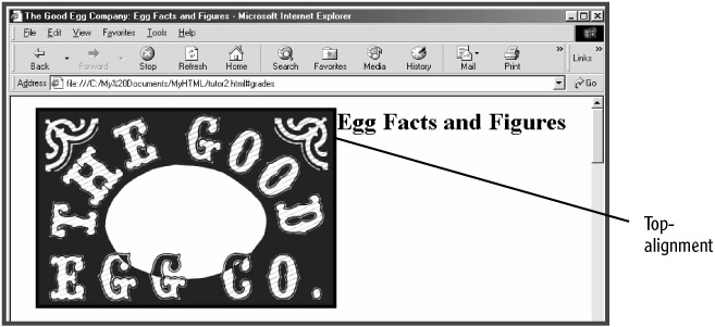 The ALIGN attribute can be used in the IMG element to vertically align the image relative to the line on which it is inserted. By default, the bottom of an image is vertically aligned with the line on which it is inserted. To see this, delete the P element in which the image is nested and cut the IMG element and paste it inside of the H1 element, as shown here (see Figure 3.15):