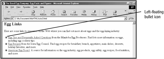 An icon link list is created using icon bullet images, instead of a UL (Unordered List) element. This method uses left-floating bullet images in conjunction with the HSPACE and VSPACE attributes to create an icon link list, with up to two lines indented in from the bullet icon. In the Egg Links section, turn the links that are already there into an indented icon link list (see Figure 4.13):