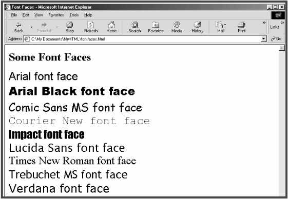 Microsoft previously provided for download a collection of TrueType core fonts for the Web, which could be downloaded and installed on Windows, Macintosh, and Unix/Linux systems. These same fonts are included with the most recent versions of both the Windows and the Macintosh operating systems. While Microsoft no longer provides these fonts for download, Linux users can find them available for download, and instructions for installing them, at corefonts.sourceforge.net/. To see a selection of font faces that are available on many Windows systems, open fontfaces.html in your browser from the resources folder in your MyHTML folder (see Figure 4.25).