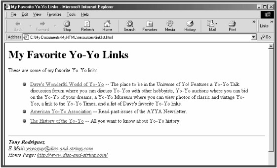 In the Saturday Afternoon session, you learned how to create indented icon link lists using left-aligned bullet images. That method worked okay, as long as no more than two lines of text needed to be indented from the margin. You can also create indented icon link lists using tables, which have no limit on the number of indented list item lines. To do this, you don't need to know anything in addition to what's already been covered in this session; you're just applying the same techniques and methods to a different purpose. To see this for yourself, just open linklist.html from the resources folder in your MyHTML folder in your text editor and browser (see Figure 5.26).