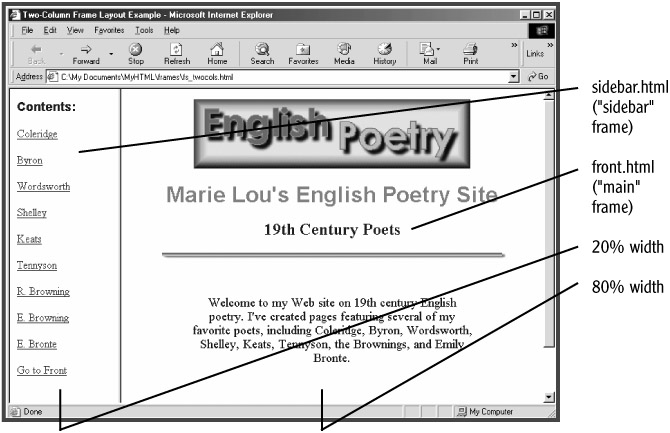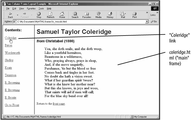 Click on the first link ("Coleridge") in the sidebar menu. The example file, coleridge.html, is displayed in the "main" frame (see Figure 6.2).