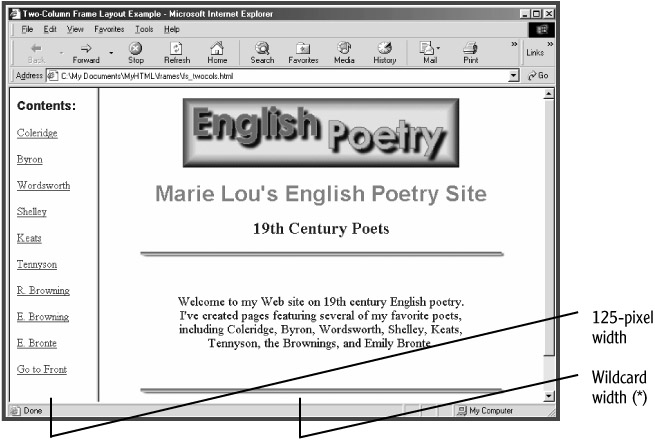 Because you have no control over the width of a browser window used to view your frame page, you might not want to set all your frame columns to percentage widths. This is especially true with a frame containing a sidebar menu; you might not want the width of that frame to expand or contract relative to the width of the browser's viewport. The solution is to set the sidebar frame to a fixed pixel width, while leaving the other column free to expand or contract along with the browser window. You do this by combining an integer value with a wildcard character (*). Reopen fr_twocols.html in your text editor and specify that the first column is to be 125 pixels wide and the second column should be free to expand or contract along with the browser window (see Figure 6.3):