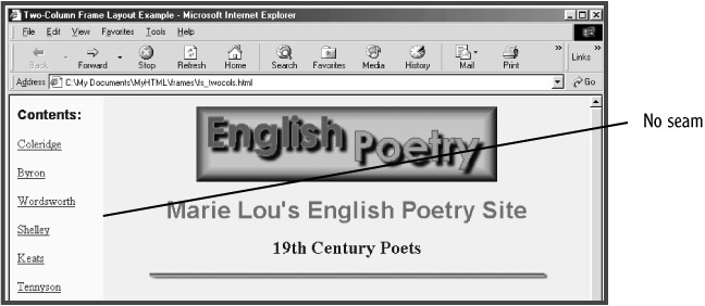 One of the questions most often asked on newsgroups covering HTML and Web publishing is how to create "seamless" frames. Seamless frames are frames where the borders between and around the frames are invisible, with the two pages in the frames adjoining each other seamlessly. In HTML 4, a frame-border="0" attribute set in each FRAME element turns off display of the frame borders, but a perceptible white seam remains visible between the frames if the backgrounds of the framed pages aren't also white. The only way, using HTML alone, to remove the seam between frames is to add a non-standard attribute, border="0", to the FRAMESET element. Use the FRAMEBORDER and BORDER attributes to create seamless frames (see Figure 6.4):