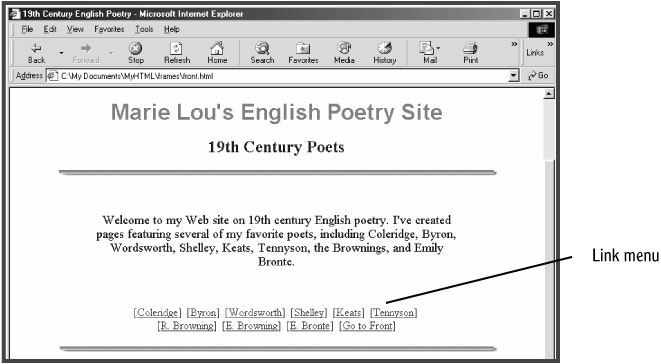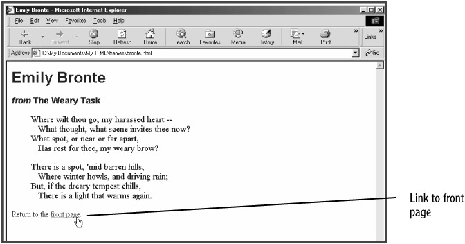 At the bottom of the other content pages that are displayed in the "main" frame, links have already been added that link back to the front page. To see an example, with front.html still open in your browser, click on the "E. Bronte" link to open the Emily Bronte page (see Figure 6.6).