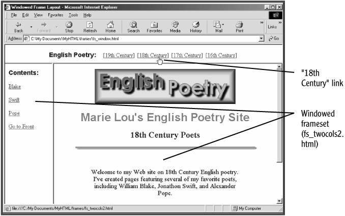Click on the "18th Century" link to switch in another nested frameset page (fs_twocols2.html). A new nested frameset page, this time featuring 18th century English poets, is displayed in the "window" frame (see Figure 6.12).