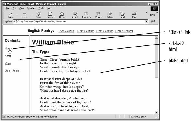Click on the "William Blake" link in the sidebar menu. A page featuring a poem by William Blake (blake.html) is displayed in the "main" window (see Figure 6.13).