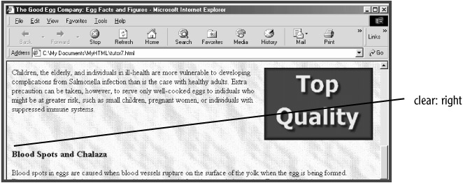In HTML, the BR element's CLEAR attribute is used to cause following text to clear a floating image. The CLEAR attribute is also deprecated in HTML 4. In CSS, you can use the clear property to cause an element to clear a floating image. For this example, you will be creating an inline style, which applies style properties directly to an element using the STYLE attribute (rather than creating an embedded style using the STYLE element). Inline styles work exactly the same way that embedded styles work, except they are quoted. They also only affect the element in which they are inserted. They can be useful when you only need an effect in a single place.