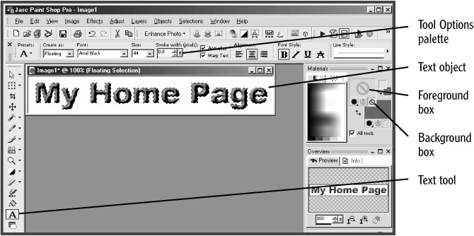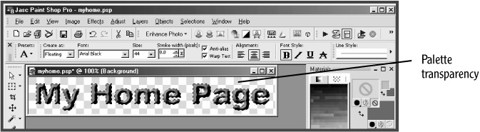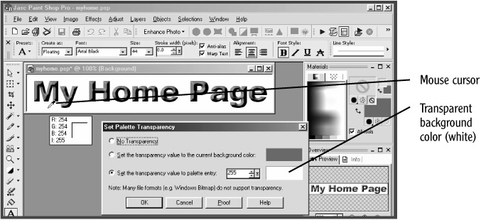 The GIF image format also lets you save an image with one color displayed as transparent. This allows you to display an image on a Web page, for instance, with the page's background color or image showing through the transparent areas of your image. To specify the background color of a text banner as transparent, you would do the following in Paint Shop Pro 8: