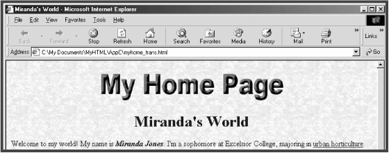 To see your transparent GIF image in action, you need to insert it in a Web page with a background color or image set. An example Web page has already been created for you that shows a transparent GIF image displayed against a background image. In your browser, just open myhome_trans.html from the AppC folder (see Figure C.4).