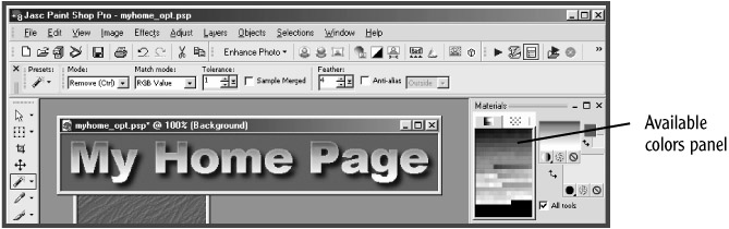 To optimize a color palette for an image you want to save as a GIF image in Paint Shop Pro 8, first select Image, Decrease Color Depth, and X Colors (4/8 bit). Click OK to flatten the image to a single layer. Select 216 as the number of colors, for instance, leave Optimized Median Cut selected, and select Nearest color as the reduction method. Leave all other options as they are. Click OK. Notice that the panel of available colors (in the Materials tool palette) is now displaying only 256 colors that are included within the image, instead of the full range of 16.7 million colors from the 24-bit color palette (see Figure C.8).