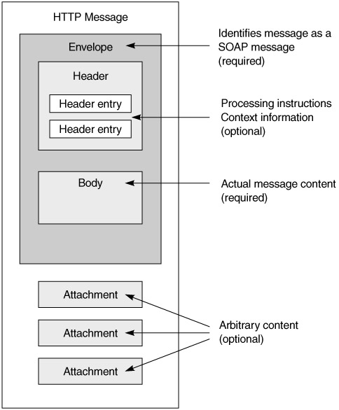 A SOAP message is a well-formed XML document that contains an Envelope element, an optional Header element, and a mandatory Body element, as Figure 4.4 shows.