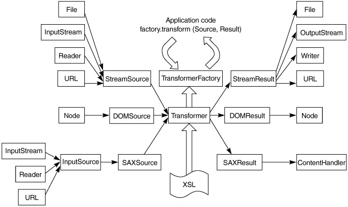 As Figure 9.8 shows, JAXP is used to instantiate a TransformerFactory, which, in turn, is used to obtain a reference to a Transfomer specific to a style sheet. A Transformer takes a Source and transforms it into a Result. The source can be of any type: a DOMSource,a SAXSource (or the content parsed by a SAX parser), or a StreamSource.