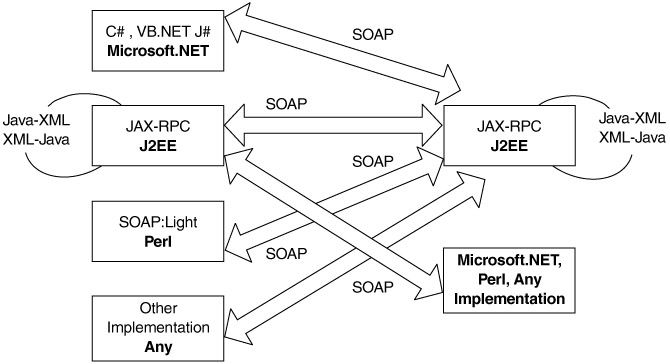 This does not mean that a JAX-RPC client can call only a JAX-RPC service and a JAX-RPC service can be used only by a JAX-RPC client. An application could still use a JAX-RPC client to invoke a .NET service and a .NET client to invoke a JAX-RPC service, as we will demonstrate later. As Figure 10.2 shows, because the data format, object communication protocol, and transport protocol are platform- and vendor-implementation independent, the application can be accessed by any client on any platform, as long as it uses these standards. The data type mapping and serialization rules defined by JAX-RPC are useful when the JAX-RPC runtime is being used on the Java platform at the client or server end.