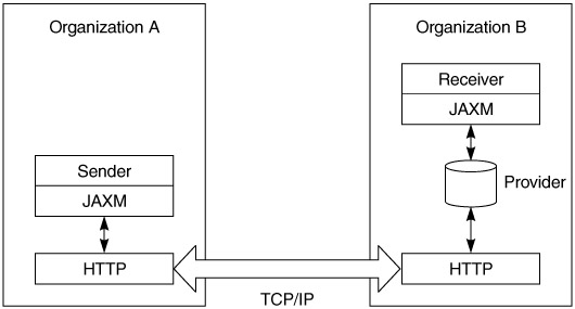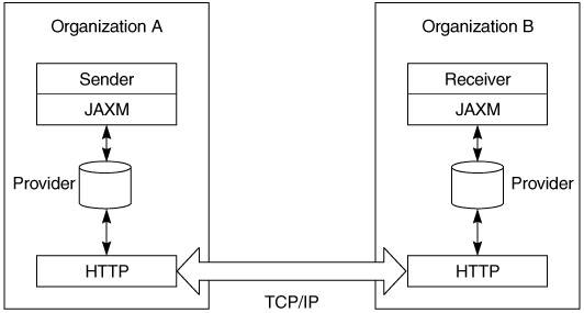 A message sender and consumer (or client and server) are more logical views than physical entities in an architecture. An application using a JAXM provider can function in a client as well as service role, meaning it is capable of switching between a message sender and message consumer. An application that does not use a JAXM provider can support only a client role and can send messages only synchronously (such applications are also referred to as standalone JAXM clients).